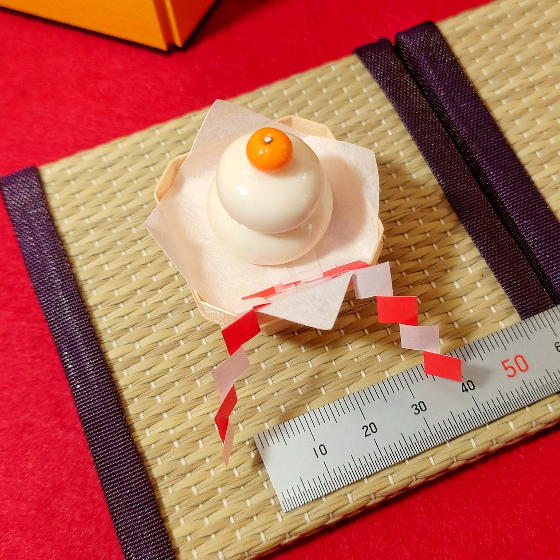このセットには、橙や紙垂、ミニ半紙も付属しています。さらに、新作のミニチュア畳に載せると、一層の雰囲気を楽しめます。畳はオプションで選択可能です。